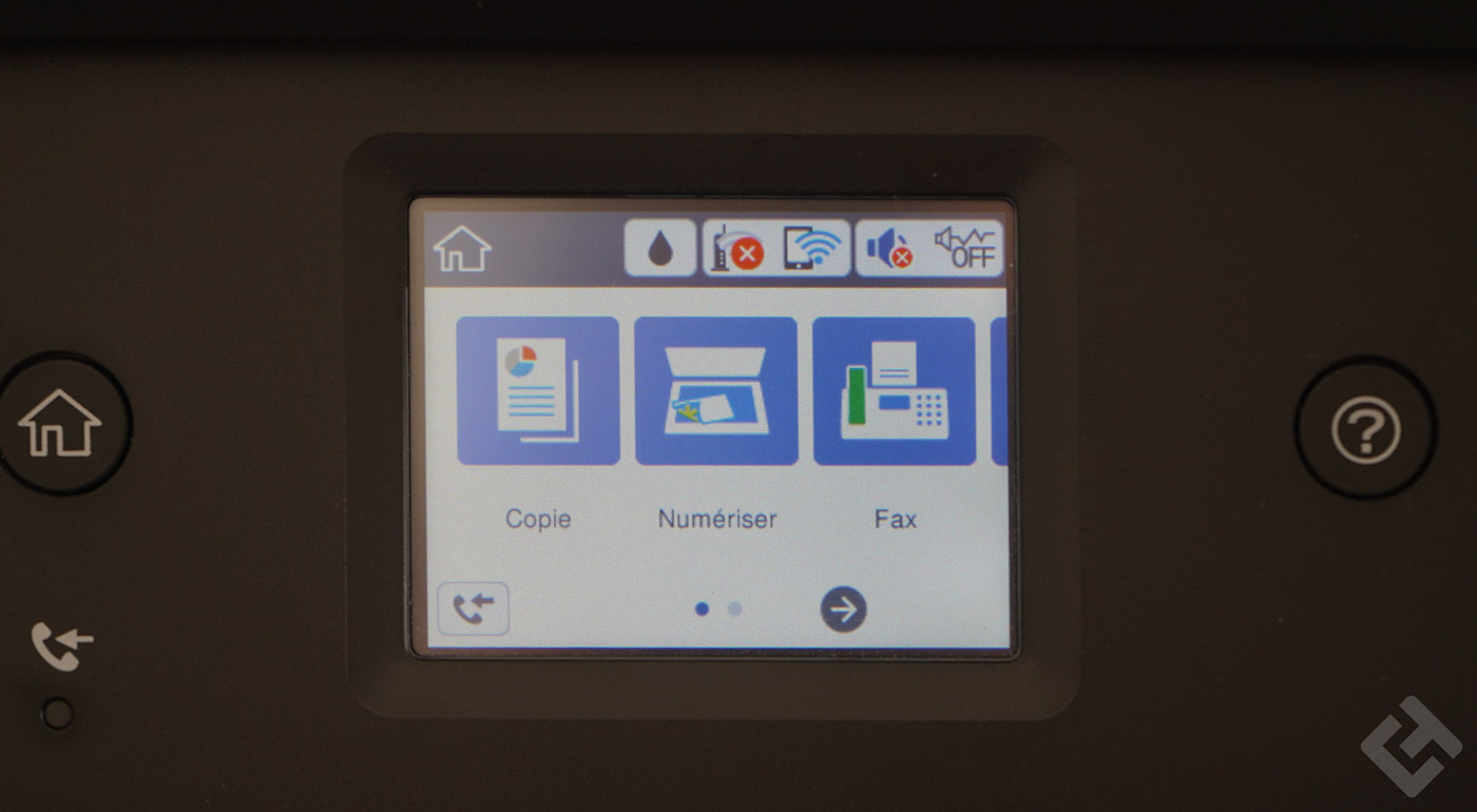 Sur sa face, on remarque l’écran tactile et trois boutons. L’un sert à allumer l’imprimante et à l’éteindre, l’autre à aller au menu principal et un dernier, à obtenir de l’aide en cas de soucis avec. L’écran tactile n’est pas très grand avec ses 2.56 pouces de diagonale, mais son ergonomie est généralement bien gérée, peut-être à quelques exceptions près.