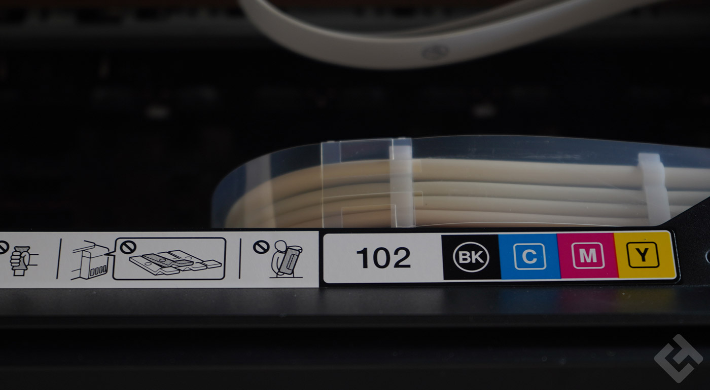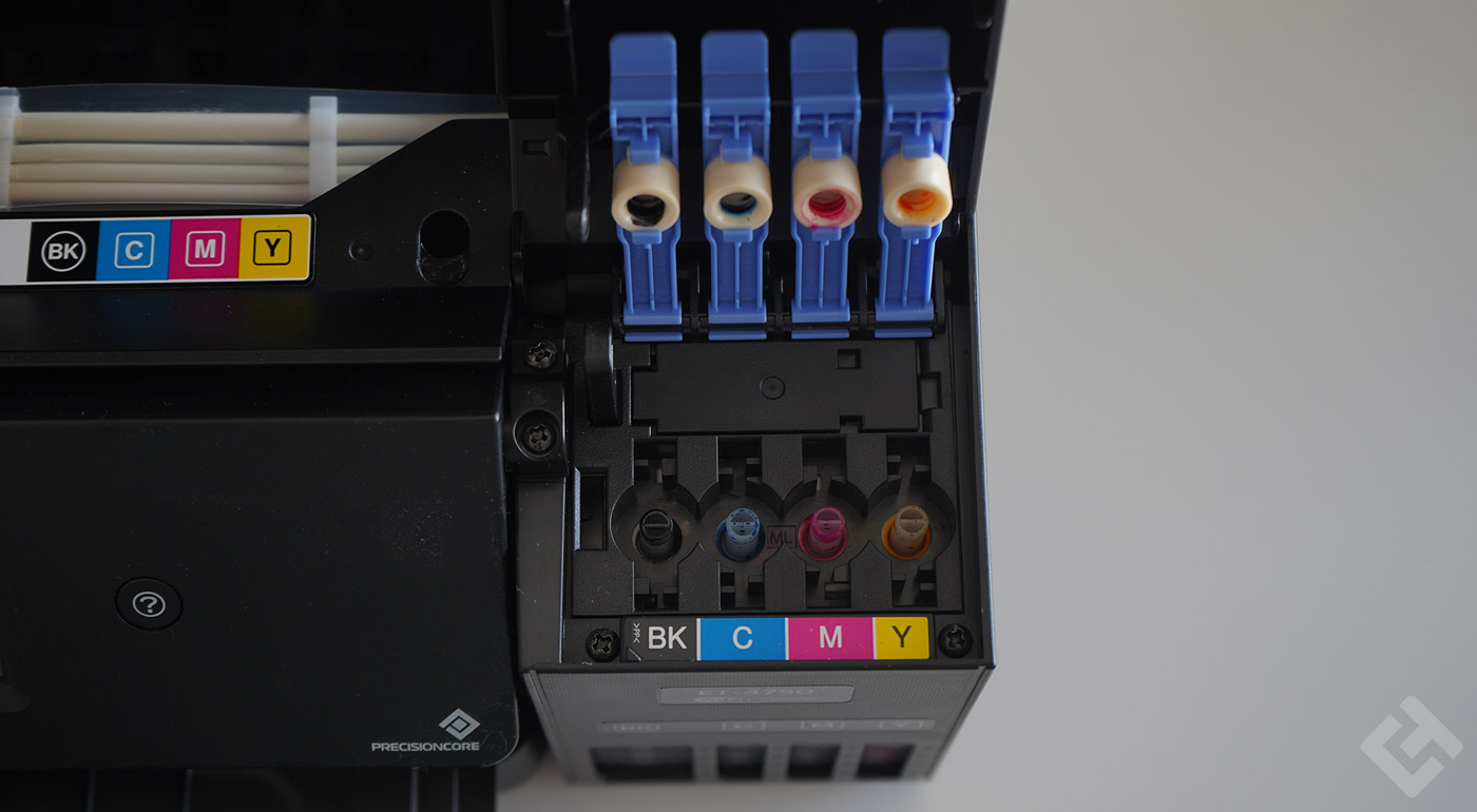 Sur la droite, se trouvent les réservoirs d’encre, avec un témoin visible, montrant clairement la quantité d’encre qu’il reste dans chaque bac. Afin d’éviter d’endommager l’encre, les parties en plastiques sont un peu brouillées, pour ne pas laisser passer trop de lumière, qui pourrait altérer la qualité de l’encre de la ET 4750.
