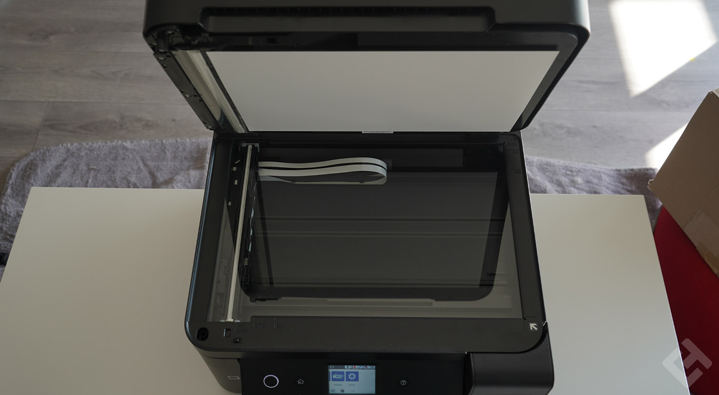 Pour avoir testé auparavant la Epson EcoTank ET 2720, il faut savoir que, plus haut de gamme, la ET 4750 est également plus volumineuse que sa petite sœur. On remarque ici un chargeur avant pour le papier, le seul et unique chargeur. Il n’est pas possible d’insérer les feuilles par l’arrière sur ce modèle. Cependant, la EcoTank ET 4750 propose bien d’autres fonctionnalités. En effet, si l’on déplie sa surface supérieure, nous avons la possibilité de scanner ou photocopier rapidement des documents.