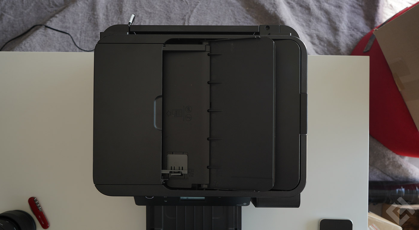 Pour ce qui est des scans et des photocopies, il existe deux possibilités pour charger le papier. Soit feuille par feuille sur la vitre avec un scan de haute qualité ou une photocopie d’une qualité très bonne, soit pour un résultat plus rapide, via le chargeur au dessus de l’imprimante. Certes, le résultat ne sera pas aussi bon que sur le ScanSnap iX1600, mais ça reste toutefois assez rapide pour quelques photocopies, et ça évite de changer la feuille systématiquement.