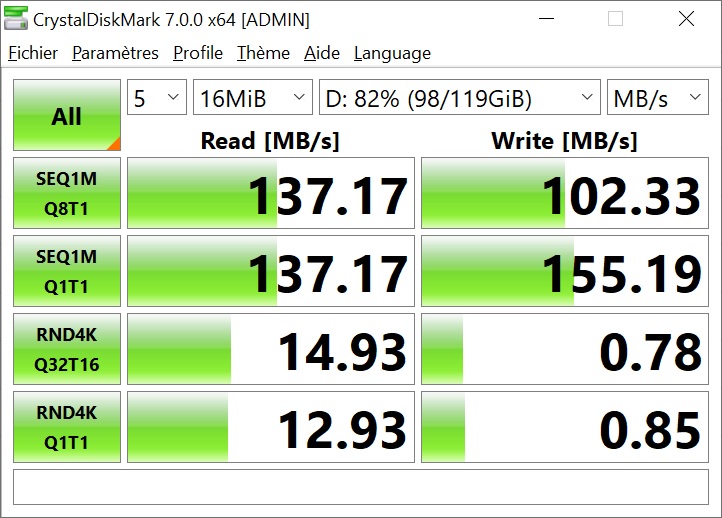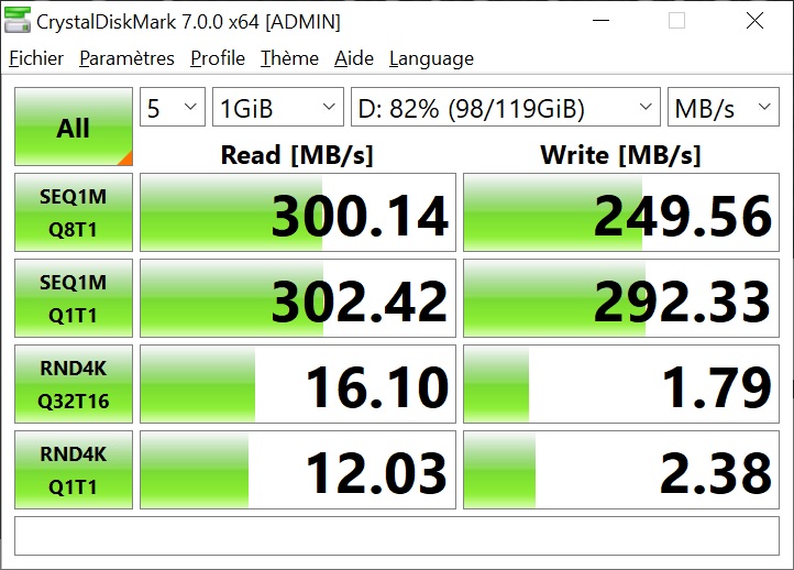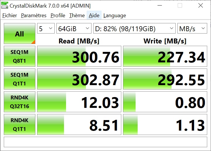 Vitesse en lecture séquentielle 137 Mo/s 201 Mo/s 263 Mo/s 300 Mo/s 304 Mo/s 300 Mo/s
