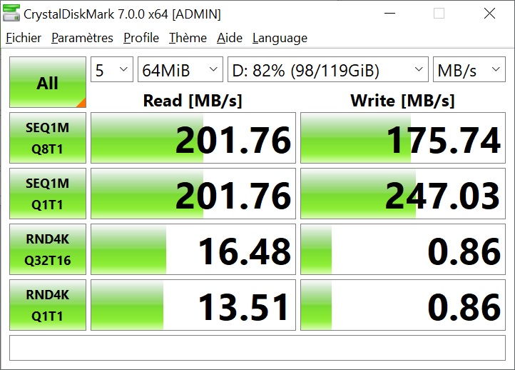 Au fait, on vous parlait d’un autre lecteur de cartes SD en début d’article. Ce dernier, en métal et plus qualitatif fait-il l’affaire ? A noter qu’il est également plus ancien. Comme nous sommes curieux, nous avons fait quelques petits benchmarks … à tort. En effet, l’adaptateur SD vers USB fourni avec la carte est très performant et offre de très bons débits ! Cependant, celui que nous avions se fait un peu vieux et n’offre pas des débits exceptionnels, bien loin de là. D’où l’importance de fournir le lecteur adéquat.