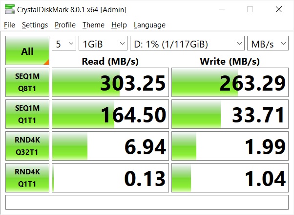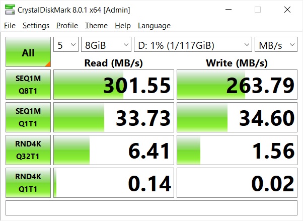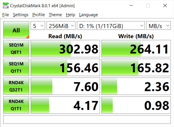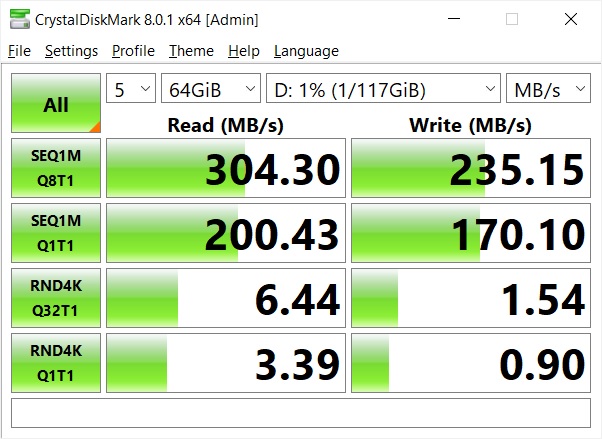 | Vitesse en lecture séquentielle | 137 Mo/s | 201 Mo/s | 263 Mo/s | 300 Mo/s | 304 Mo/s | 300 Mo/s |
