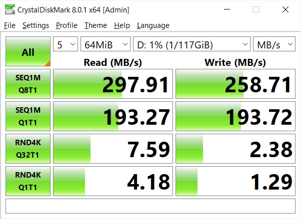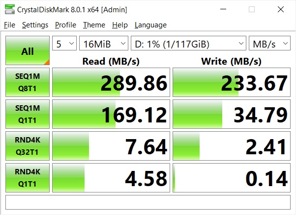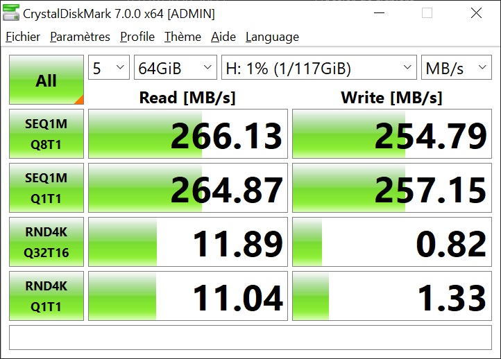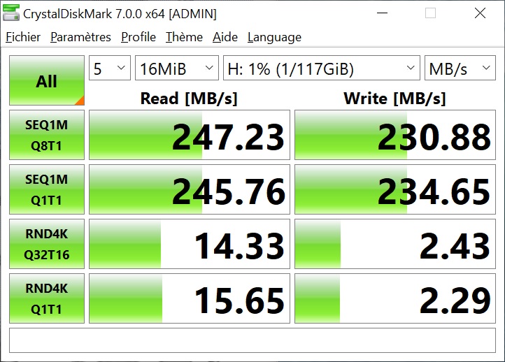 Pour ce qui est des débits avec CrystalDiskMark, ils sont décevants au premier abord. Avec seulement 250 Mo/s en lecture et 230 Mo/s en écriture approximativement, ça n’est pas à la hauteur de ce que l’on attend. Cependant, après quelques essais de manière différente, nous avons trouvé les bons débits. Le souci ne vient pas de la carte SD en elle-même, mais bel et bien du dongle USB fourni avec cette dernière. Nous avons fait le test avec un lecteur de cartes externe de chez Lexar, qui nous a donné des débits ici tout à fait conformes à ce que l’on peut attendre.