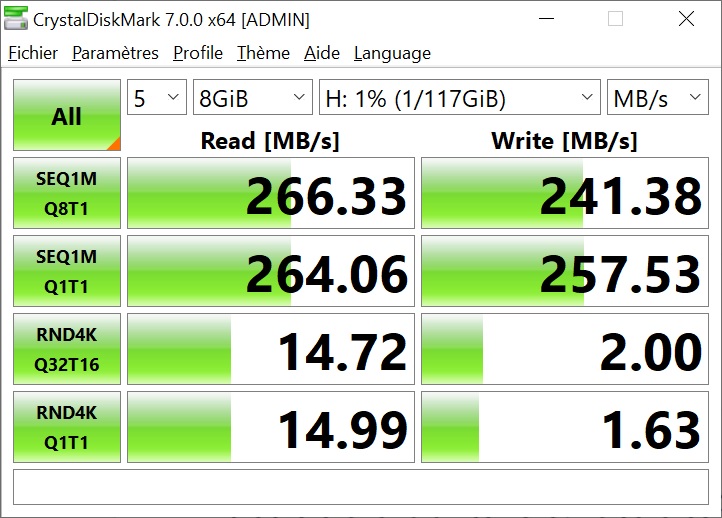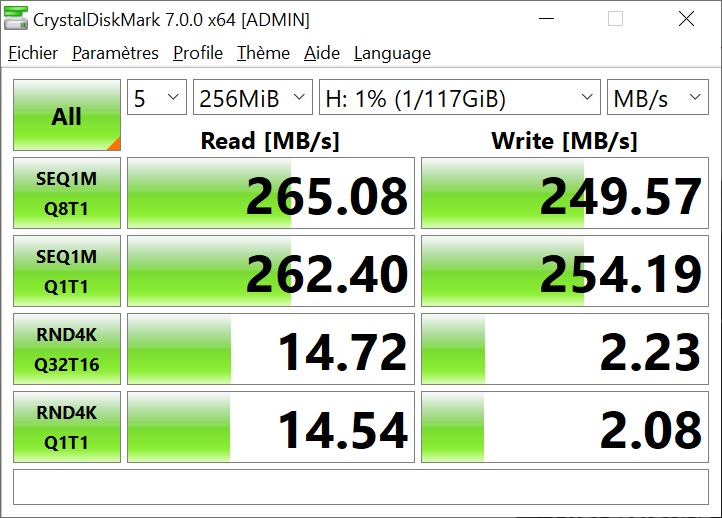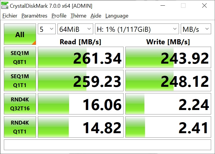 | Vitesse en écriture séquentielle | 102 Mo/s | 175 Mo/s | 223 Mo/s | 249 Mo/s | 250 Mo/s | 227 Mo/s |